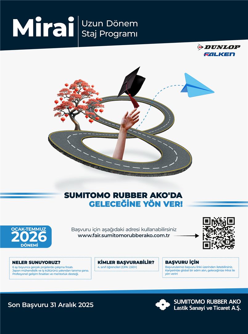 Çankırı’da binek otomobil lastiği üretimi yapan “Sumitomo Rubber AKO” Şirketinde yürütülen “MIRAI Uzun Dönem Staj Programı”, 2026 Ocak ve Temmuz dönemlerinde yeniden açılacaktır. Başvurular alınmaya başlanmıştır.